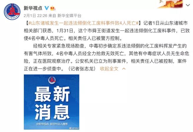 據(jù)@新華視點報道,1月31日,山東諸城市舜王街道發(fā)生一起違法傾倒化工廢料事件,已致使4名中毒人員死亡。相關責任人已被警方控制。 經(jīng)相關專家緊急現(xiàn)場勘查,中毒初步確定系違法傾倒的化工廢料揮發(fā)產(chǎn)生的有害氣體所致,4名中毒人員經(jīng)全力搶救無效死亡,其他有中毒癥狀人員無生命危險,正在醫(yī)院觀察治療。公安機關已立為刑事案件,相關責任人已被控制,案件正在進一步偵查中。 我國是一個化工產(chǎn)品需求大國,化工產(chǎn)品的產(chǎn)量一直處于高位,并且成為出口大國。但是,化工廢料的出路一直未能得到很好解決,一些農(nóng)村地區(qū)成為傾倒化工廢料的場所,不僅造成了空氣、水、土壤的嚴重污染,而且對人體健康也產(chǎn)生了直接的危害。 在近年來展開的經(jīng)濟轉(zhuǎn)型中,特別是中央提出建立環(huán)境友好型社會的目標以后,化工企業(yè)成為治理整頓的一個重點目標,廢料傾倒的規(guī)范也提上日程。 盡管如此,由傾倒化工廢料而引起的環(huán)境污染事件,近年來仍時有所聞,事件的經(jīng)過大都是企業(yè)將廢料偷偷運到農(nóng)村或偏僻地區(qū),其背后是一些化工企業(yè)目無法律、為一己方便而嫁污于人的卑劣心態(tài)。 近幾年,隨著經(jīng)濟轉(zhuǎn)型的推進,全國上下對于建設環(huán)境友好型社會已有明確的共識。今年國家新組建生態(tài)環(huán)境部,對環(huán)境污染有了更嚴格的治理,對隨意傾倒化工廢料等惡劣行為,法律一定不會姑息。 懲治犯罪人員有法可依,但要把他們造成的嚴重污染清除掉,卻需要付出巨大的代價。在江蘇泰興違法傾倒危險廢料事件中,當?shù)氐耐恋乇緛沓尸F(xiàn)為自然的土黃色,傾倒廢料后土地呈現(xiàn)為黑色,甚至50厘米之下的土壤仍然是黑色,可見污染何等嚴重。很顯然,要讓這一片土地恢復生態(tài)原貌,投入的經(jīng)濟成本將是巨大的,當?shù)卮迕駷榇烁冻龅慕】荡鷥r更是難以估量。 面對頻頻發(fā)生的化工廢料違法傾倒事件,法律之劍自然必須高懸,但同時也要看到,中國是化工生產(chǎn)大國,需要給化工廢料提供出路。在改革開放初期,原來在城區(qū)的化工企業(yè)大量搬遷到農(nóng)村地區(qū),在經(jīng)濟利益驅(qū)使之下,這甚至成為一些農(nóng)村地區(qū)搞活經(jīng)濟的一個途徑。 如今,廣大農(nóng)村地區(qū)意識到了化工廢料的危害,開始拒絕接受傾倒,企業(yè)只能尋求更遠的地方作為傾倒場所。然而,這種做法只是將問題不斷地往后推,并不能從根子上解決問題。一段時間以來,政府部門對一些不符合條件的化工企業(yè)實行了關停,這又會導致就業(yè)受到影響,因此也缺乏大范圍推廣的價值。