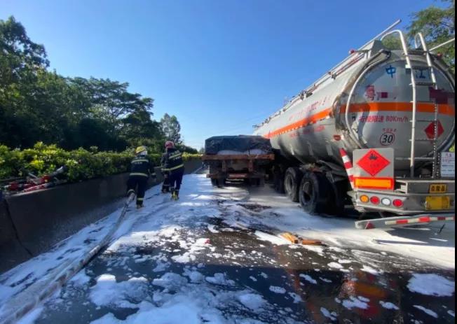 廣州市消防救援支隊(duì)12月7日通報(bào),12月6日12時(shí),廣州市119指揮中心接到警情稱沈海高速北二環(huán)機(jī)場(chǎng)高速水瀝出口路段發(fā)生一起交通事故,一輛油罐車與一輛貨車相撞,現(xiàn)場(chǎng)有大量汽油泄漏,情況緊急。消防部門接到報(bào)警后迅速趕赴現(xiàn)場(chǎng)處置。 經(jīng)了解,涉事油罐車罐體由5個(gè)獨(dú)立油罐組成,其中前四個(gè)罐儲(chǔ)油26噸、尾罐5噸。 泄漏點(diǎn)在尾罐邊緣,在與貨車碰撞后撕開一條長(zhǎng)約20厘米、寬5厘米的不規(guī)則泄漏口。地面有大片油漬,并不斷流向路邊排水溝,空氣中彌漫著汽油味。 經(jīng)查明,現(xiàn)場(chǎng)已泄漏汽油3噸左右,如果不及時(shí)處置,后果將不堪設(shè)想。 了解情況后,現(xiàn)場(chǎng)消防指揮員隨即安排隊(duì)員成立了滅火冷卻組、搶險(xiǎn)組、疏散警戒組等作戰(zhàn)單元,協(xié)同民警對(duì)現(xiàn)場(chǎng)進(jìn)行警戒,禁止無(wú)關(guān)人員和車輛駛?cè)。滅火組做好防靜電措施后,在泄漏點(diǎn)架設(shè)水炮進(jìn)行泡沫覆蓋冷卻罐體,并稀釋現(xiàn)場(chǎng)泄漏的汽油, 多部門通力合作5個(gè)多小時(shí),終于將油罐車體泄漏口成功堵漏,并轉(zhuǎn)移罐體,完成現(xiàn)場(chǎng)污水回收。因處置科學(xué)及時(shí),事故未造成人員傷亡,事故原因還在調(diào)查中。