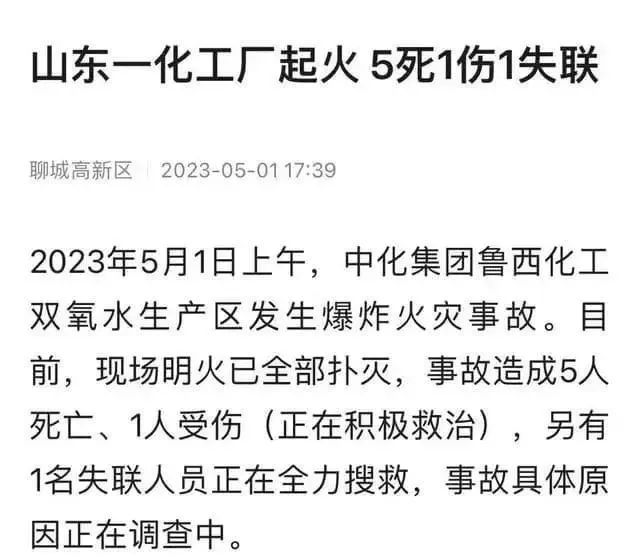 5月1日上午8點(diǎn)30分左右,有聊城市茌平區(qū)和東阿縣的網(wǎng)友忽然聽到一聲巨響,震得門窗亂晃。隨后,網(wǎng)上傳出多段疑似魯西化工區(qū)域濃煙滾滾的視頻。 在當(dāng)?shù)匾粋(gè)區(qū)域頭條群,有很多購買了魯西化工股票的網(wǎng)友有點(diǎn)恐慌,交流中可以看出希望這是條假消息。 據(jù)當(dāng)?shù)匾晃淮迕穹Q,聽到響聲時(shí)他在離工業(yè)園區(qū)7公里外的東阿縣城,12點(diǎn)左右,他到現(xiàn)場時(shí)看到火已經(jīng)滅掉,濃煙也已止住,現(xiàn)場有消防車作業(yè),并有多輛救護(hù)車出入。 下午5點(diǎn)39分,據(jù)魯西化工所在地聊城市高新區(qū)官方發(fā)布,中化集團(tuán)魯西化工雙氧水生產(chǎn)區(qū)發(fā)生的爆炸火災(zāi)事故,已經(jīng)造成了5人死亡、1人受傷,另有1名失聯(lián)人員正在全力搜救。 有網(wǎng)友轉(zhuǎn)發(fā)到頭條群的山東應(yīng)急管理發(fā)布的一篇微博顯示,4月29日,聊城市應(yīng)急局局長曾帶隊(duì)到魯西化工督導(dǎo)檢查“五一”假期期間安全生產(chǎn)工作,強(qiáng)調(diào)生產(chǎn)經(jīng)營單位落實(shí)安全防范措施,在前期工作的基礎(chǔ)上對(duì)當(dāng)前安全生產(chǎn)工作再部署、再落實(shí)、再推進(jìn),嚴(yán)防各類事故發(fā)生。 事故警示信息 2023年5月1日8時(shí)36分許,山東聊城魯西化工雙氧水新材料科技有限公司1號(hào)雙氧水裝置發(fā)生爆炸,已造成重大人員傷亡。事故原因初步分析為,雙氧水裝置工作液配置釜用于回收工作液時(shí),吸入大量70%濃度雙氧水,釜內(nèi)可能存在雜質(zhì)造成雙氧水劇烈分解,引發(fā)配置釜超壓爆炸,造成現(xiàn)場人員傷亡,并波及相鄰企業(yè)辛醇儲(chǔ)罐及部分管線泄漏燃燒,詳細(xì)原因正在調(diào)查中。 各地區(qū)、有關(guān)企業(yè)要深刻吸取事故教訓(xùn),舉一反三,迅速落實(shí)重大隱患排查治理專項(xiàng)行動(dòng)部署,切實(shí)強(qiáng)化重大風(fēng)險(xiǎn)管控,堅(jiān)決防范遏制重特大事故。一是聚焦雙氧水工作液配置釜、氫化塔、氧化塔等重點(diǎn)部位和加氫,過氧化,工作液回收等事故易發(fā)環(huán)節(jié),強(qiáng)化隱患排查治理,落實(shí)風(fēng)險(xiǎn)管控措施。二是嚴(yán)格檢維修管理,節(jié)日期間原則上不得開展動(dòng)火等特殊作業(yè),確需開展的要提級(jí)管理并嚴(yán)格落實(shí)GB30871相關(guān)要求。三是嚴(yán)格限制裝置區(qū)人員數(shù)量,特別是存在爆炸風(fēng)險(xiǎn)的化工裝置區(qū)嚴(yán)禁人員聚集扎堆。 地方各級(jí)應(yīng)急部門要主動(dòng)研判本地區(qū);钒踩L(fēng)險(xiǎn),全面摸排、監(jiān)督落實(shí)安全措施;充分利用風(fēng)險(xiǎn)監(jiān)測預(yù)警系統(tǒng)在線巡查、明查暗訪、舉報(bào)獎(jiǎng)勵(lì)等手段,及時(shí)發(fā)現(xiàn)查處違法違規(guī)行為,為安全生產(chǎn)形勢平穩(wěn)提供有力保障。請(qǐng)各地區(qū)迅速將事故警示信息傳遞給有關(guān)企業(yè)。