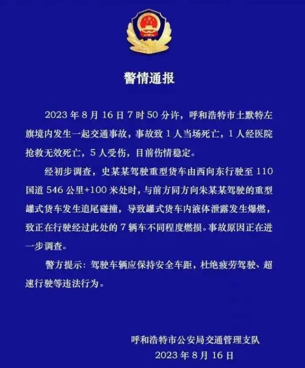 8月16日,呼和浩特市土默特左旗一輛重型;饭捃(chē)與多車(chē)相撞,發(fā)生爆燃,事故造成2人死亡,5人受傷。 視頻顯示,至少有三輛大車(chē)并排停在公路上,車(chē)身起火冒起濃煙,路牌顯示事故地點(diǎn)距離賈力更故居15公里。拍攝者身處一片草叢中,遠(yuǎn)處火焰熊熊燃燒,黑煙漫天,同時(shí)傳出爆炸聲響。 據(jù)@平安青城通報(bào):8月16日7時(shí)50 分許,呼和浩特市土默特左旗境內(nèi)發(fā)生一起交通事故,事故致1人當(dāng)場(chǎng)死亡,1人經(jīng)醫(yī)院搶救無(wú)效死亡,5人受傷,目前傷情穩(wěn)定。 經(jīng)初步調(diào)查,史某某駕駛重型貨車(chē)由西向東行駛至110國(guó)道 546 公里+100 米處時(shí),與前方同方向朱某某駕駛的重型罐式貨車(chē)發(fā)生追尾碰撞,導(dǎo)致罐式貨車(chē)內(nèi)液體泄漏發(fā)生爆燃致正在行駛經(jīng)過(guò)此處的7輛車(chē)不同程度燃損。事故原因正在進(jìn)一步調(diào)查。