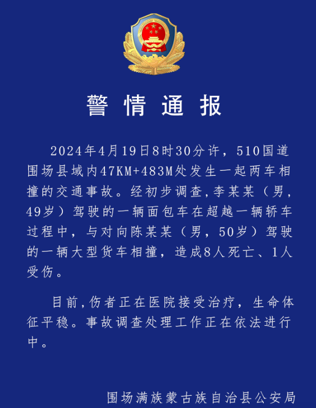 4月19日8時(shí)30分許,510國(guó)道圍場(chǎng)滿族蒙古族自治縣縣域內(nèi)47KM+483M 處發(fā)生一起兩車相撞的交通事故。經(jīng)初步調(diào)查,李某某(男,49歲)駕駛的一輛面包車在超越一輛轎車過程中,與對(duì)向陳某某(男,50歲)駕駛的一輛大型貨車相撞,造成8人死亡、1人受傷。目前,傷者正在醫(yī)院接受治療,生命體征平穩(wěn)。事故調(diào)查處理工作正在依法進(jìn)行中。