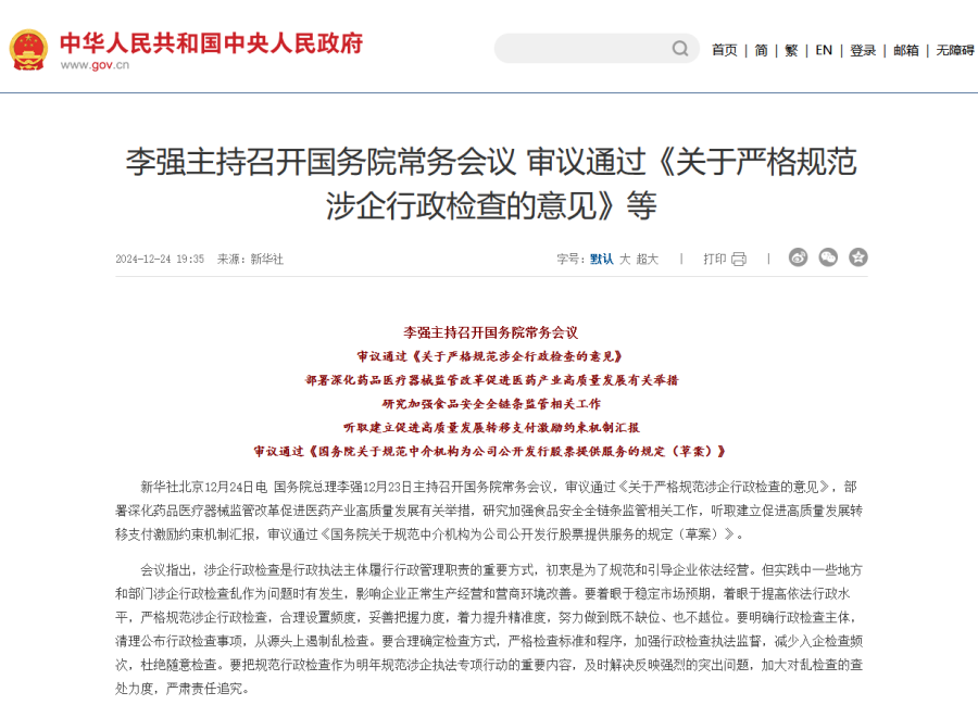 國務院總理李強12月23日主持召開國務院常務會議,審議通過《關于嚴格規(guī)范涉企行政檢查的意見》,部署深化藥品醫(yī)療器械監(jiān)管改革促進醫(yī)藥產(chǎn)業(yè)高質(zhì)量發(fā)展有關舉措,研究加強食品安全全鏈條監(jiān)管相關工作,聽取建立促進高質(zhì)量發(fā)展轉(zhuǎn)移支付激勵約束機制匯報,審議通過《國務院關于規(guī)范中介機構(gòu)為公司公開發(fā)行股票提供服務的規(guī)定(草案)》。 會議指出,涉企行政檢查是行政執(zhí)法主體履行行政管理職責的重要方式,初衷是為了規(guī)范和引導企業(yè)依法經(jīng)營。但實踐中一些地方和部門涉企行政檢查亂作為問題時有發(fā)生,影響企業(yè)正常生產(chǎn)經(jīng)營和營商環(huán)境改善。要著眼于穩(wěn)定市場預期,著眼于提高依法行政水平,嚴格規(guī)范涉企行政檢查,合理設置頻度,妥善把握力度,著力提升精準度,努力做到既不缺位、也不越位。要明確行政檢查主體,清理公布行政檢查事項,從源頭上遏制亂檢查。要合理確定檢查方式,嚴格檢查標準和程序,加強行政檢查執(zhí)法監(jiān)督,減少入企檢查頻次,杜絕隨意檢查。要把規(guī)范行政檢查作為明年規(guī)范涉企執(zhí)法專項行動的重要內(nèi)容,及時解決反映強烈的突出問題,加大對亂檢查的查處力度,嚴肅責任追究。 會議還研究了其他事項。