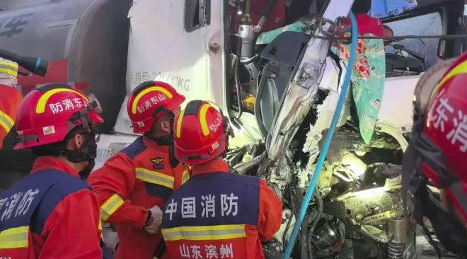 5月15日3時49分,山東濱州市消防救援支隊(duì)指揮中心接到報警稱,沾化區(qū)340國道徒駭河大橋紅綠燈附近發(fā)生一起車禍?zhǔn)鹿,兩人被困,接警后,沾化?jīng)濟(jì)開發(fā)區(qū)特勤消防救援站立即出動消防救援人員趕赴現(xiàn)場處置。消防救援人員到達(dá)現(xiàn)場后發(fā)現(xiàn),事故現(xiàn)場為一輛油罐車追尾一輛半掛車,油罐車駕駛室嚴(yán)重變形,車頭被擠扁,司機(jī)及押運(yùn)人員分別被變形的操作臺壓住右腳和左腳,無法脫困。 了解情況后,指揮員立即下達(dá)救援命令:警戒組與現(xiàn)場交警部門協(xié)同合作,對事故現(xiàn)場實(shí)施交通管制與引導(dǎo);救援組立即展開行動,決定破拆副駕駛室車門率先對押運(yùn)人員實(shí)施救援,首先利用無齒鋸對車門鉸鏈進(jìn)行切割,但鉸鏈為鑄鐵材質(zhì),一時難以割斷。 為節(jié)省救援時間,消防救援人員嘗試用拖車對油罐車駕駛室右側(cè)A柱進(jìn)行拖拽牽引,無奈效果不明顯。隨后,消防救援人員再次使用液壓破拆工具組對副駕駛室車門進(jìn)行破拆,車門被成功打開后,借助液壓擴(kuò)張鉗不斷擴(kuò)張押運(yùn)人員左腳的被卡位置,增大救援空間,經(jīng)過1個多小時的緊張救援,押運(yùn)人員被成功救出,交由現(xiàn)場等候的120醫(yī)護(hù)人員,送往醫(yī)院接受治療,同時,被困司機(jī)的右腳也拔了出來,自行由駕駛室車門脫困,現(xiàn)場交通恢復(fù)正常通行。事后,從被困司機(jī)處了解到,事發(fā)時霧太大,加之前車尾燈損壞不亮,導(dǎo)致在紅綠燈路口剎車不及造成追尾。