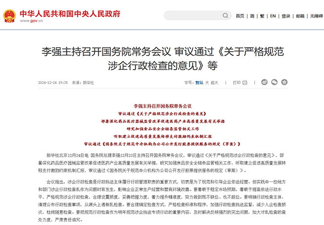國務院總理李強12月23日主持召開國務院常務會議,審議通過《關于嚴格規(guī)范涉企行政檢查的意見》,部署深化藥品醫(yī)療器械監(jiān)管改革促進醫(yī)藥產(chǎn)業(yè)高質量發(fā)展有關舉措,研究加強食品安全全鏈條監(jiān)管相關工作,聽取建立促進高質量發(fā)展轉移支付激勵約束機制匯報,審議通過《國務院關于規(guī)范中介機構為公司公開...