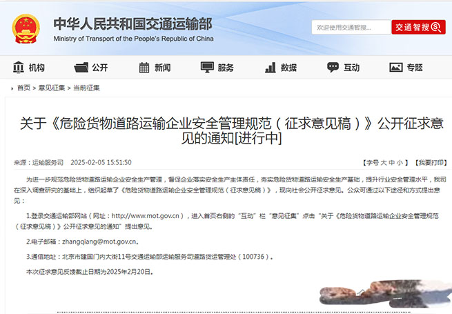 為進一步規(guī)范危險貨物道路運輸企業(yè)安全生產(chǎn)管理,督促企業(yè)落實安全生產(chǎn)主體責任,夯實危險貨物道路運輸安全生產(chǎn)基礎(chǔ),提升行業(yè)安全管理水平,近日,交通運輸部運輸服務司在深入調(diào)查研究的基礎(chǔ)上,組織起草了《危險貨物道路運輸企業(yè)安全管理規(guī)范(征求意見稿)》,現(xiàn)向社會公開征求意見。根據(jù)當前危險貨...